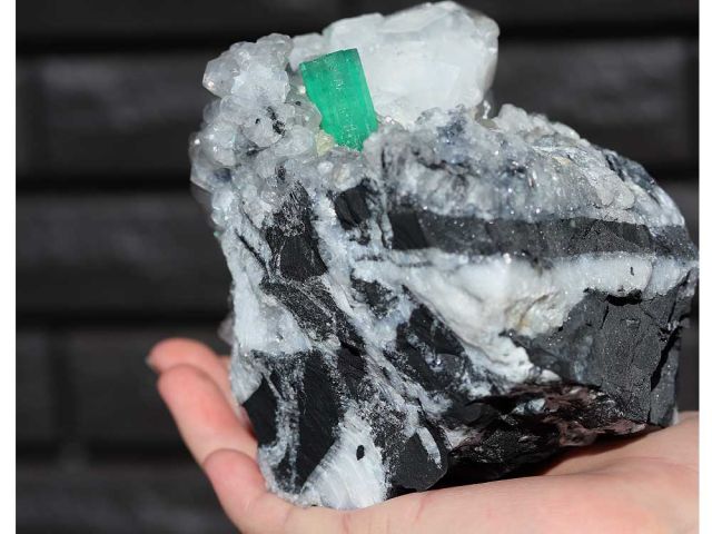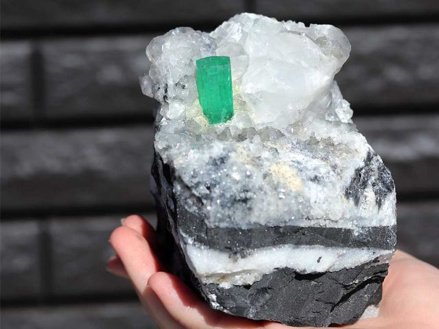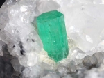 エメラルドの結晶は透明で、色も美しいです。水晶が周りについているので、明るく照らしているかのように見えます。