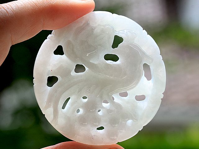 この石の色はほんのり緑かかっていて、彫も複雑であり、表からも裏にも彫が入っていて、複雑に彫ってあります。絵柄は鳳凰で、冠がついいるので、位の高さを象徴しています。