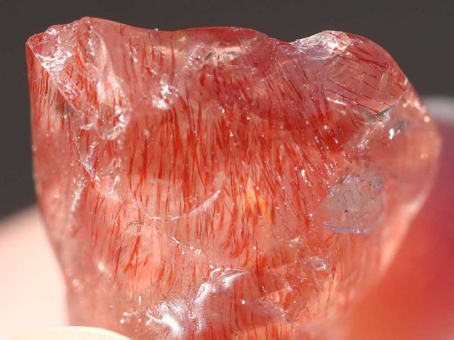 レピドクロサイトは和名で鱗鉄鉱。別名、 水晶の鉱物の内部にインクルージョンとして混入する物質の一種です。針状・毛髪状・繊維状・粉状の内包物となって出現することが多いとされています。水晶の中に、赤色の鱗鉄鉱と赤色の針鉄鉱が混入したもので、薄いピンク色であればストロベリークォーツと言います。