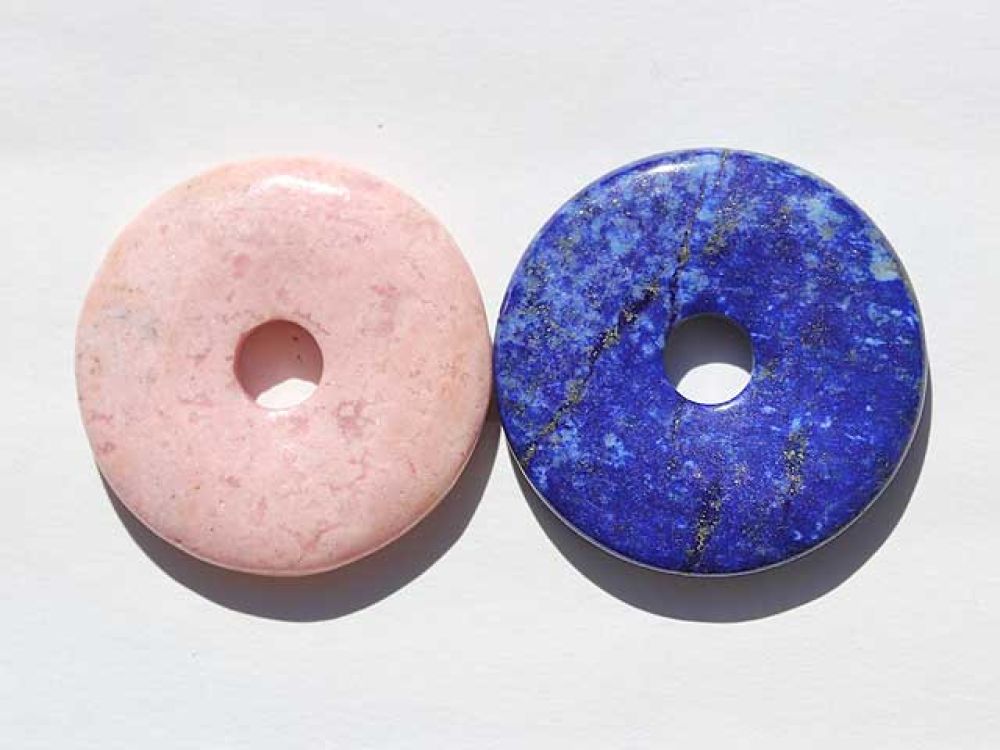 ラピスラズリとロードクロサイトのピーと呼ばれるドーナツ型の天然石2つセットです。