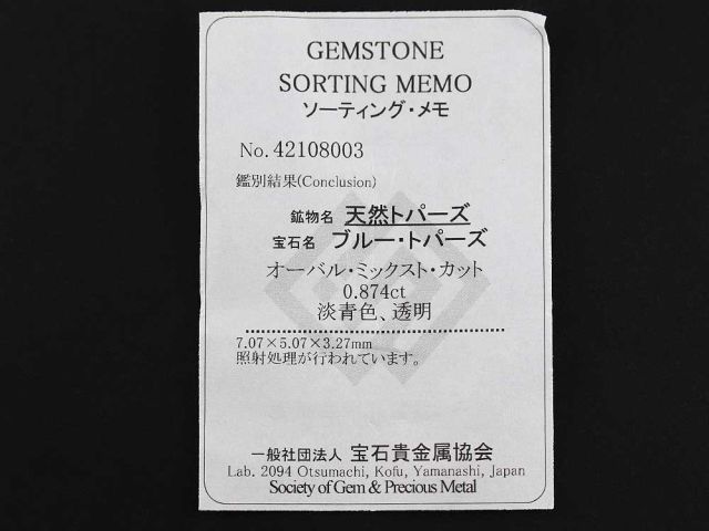 魅了 ブルートパーズ ルース 8003 鑑別メモ付
