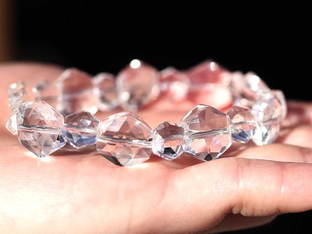 ブレスレットは両手にしてほしいです。ヘキサゴンはのなかでも、このカットは三角△ガットが並んで作られています。これを、ハーフダッチローズカットといい、両面に施しております。