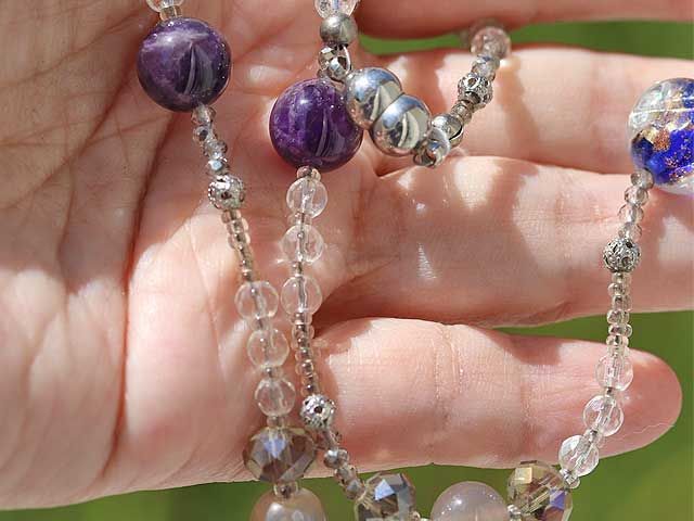 水色のビーズはベネチアン、アメシストと瑪瑙を混ぜ合わせ、おしゃれに仕上げてあります。磁石なので留めが簡単です。